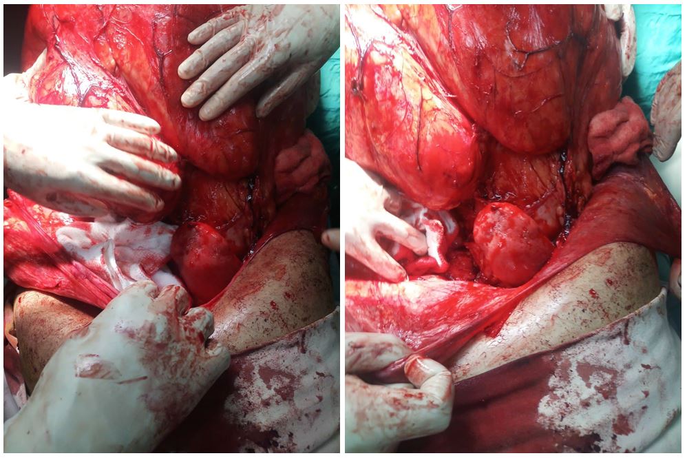 Operative findings: under general anesthesia the abdomen was approached through a midline vertical incision and a huge right retroperitoneal mass had displaced the cecum and ascending colon.